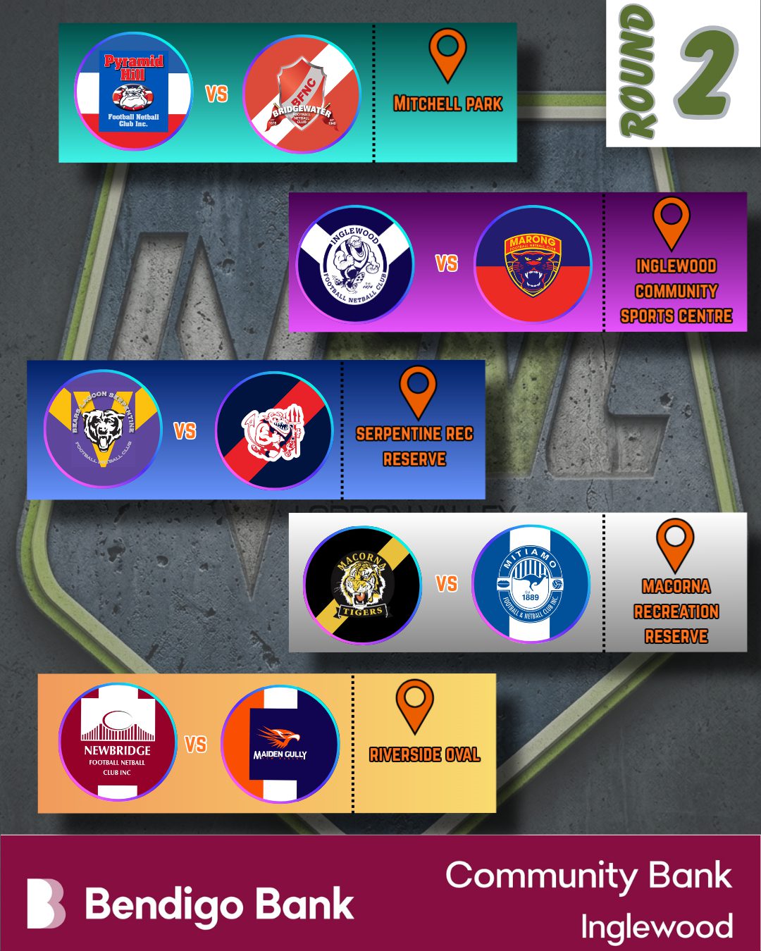 Bridgewater 377 per cent, 4 points; Macorna 207, 4; Marong 145, 4; Pyramid Hill 132, 4; Calivil United 120, 4; Mitiamo 83, 0; Inglewood 75, 0; Bears Lagoon-Serpentine 68, 0; Maiden Gully YCW Eagles 48, 0; Newbridge 26, 0.