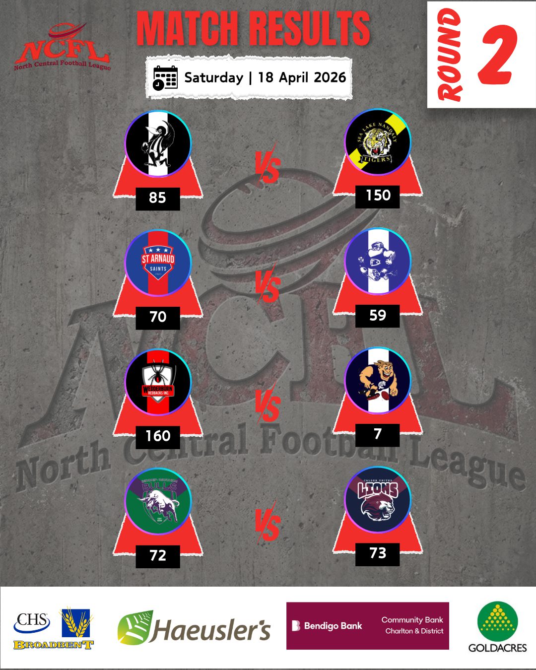 Wedderburn 436 per cent, 8 points; St Arnaud 272, 8; Sea Lake Nandaly Tigers 176, 8; Donald 99, 4; Calder United Lions 84, 4; Birchip-Watchem 77, 0; Boort 67, 0; Charlton 7, 0.