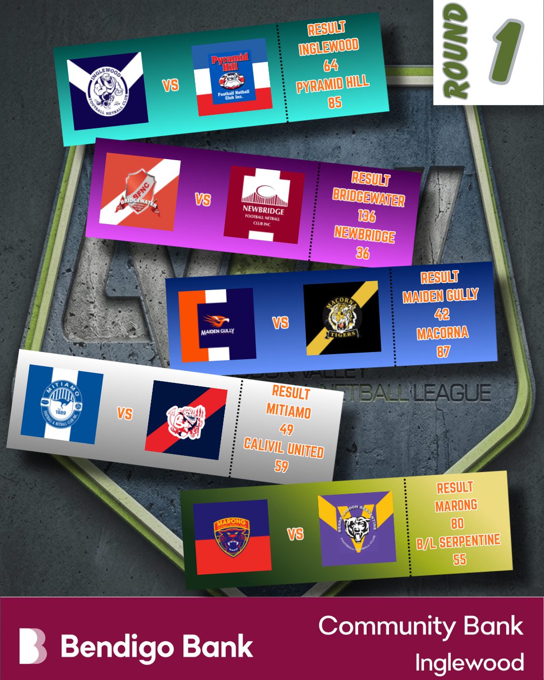 Bridgewater 23 .lt Newbridge 45, Inglewood 39 d Pyramid Hill 31, Marong 40 dr Bears Lagoon-Serpentine 40, Maiden Gully YCW Eagles 34 d Macorna 30, Mitiamo 19 lt Calivil United 48.