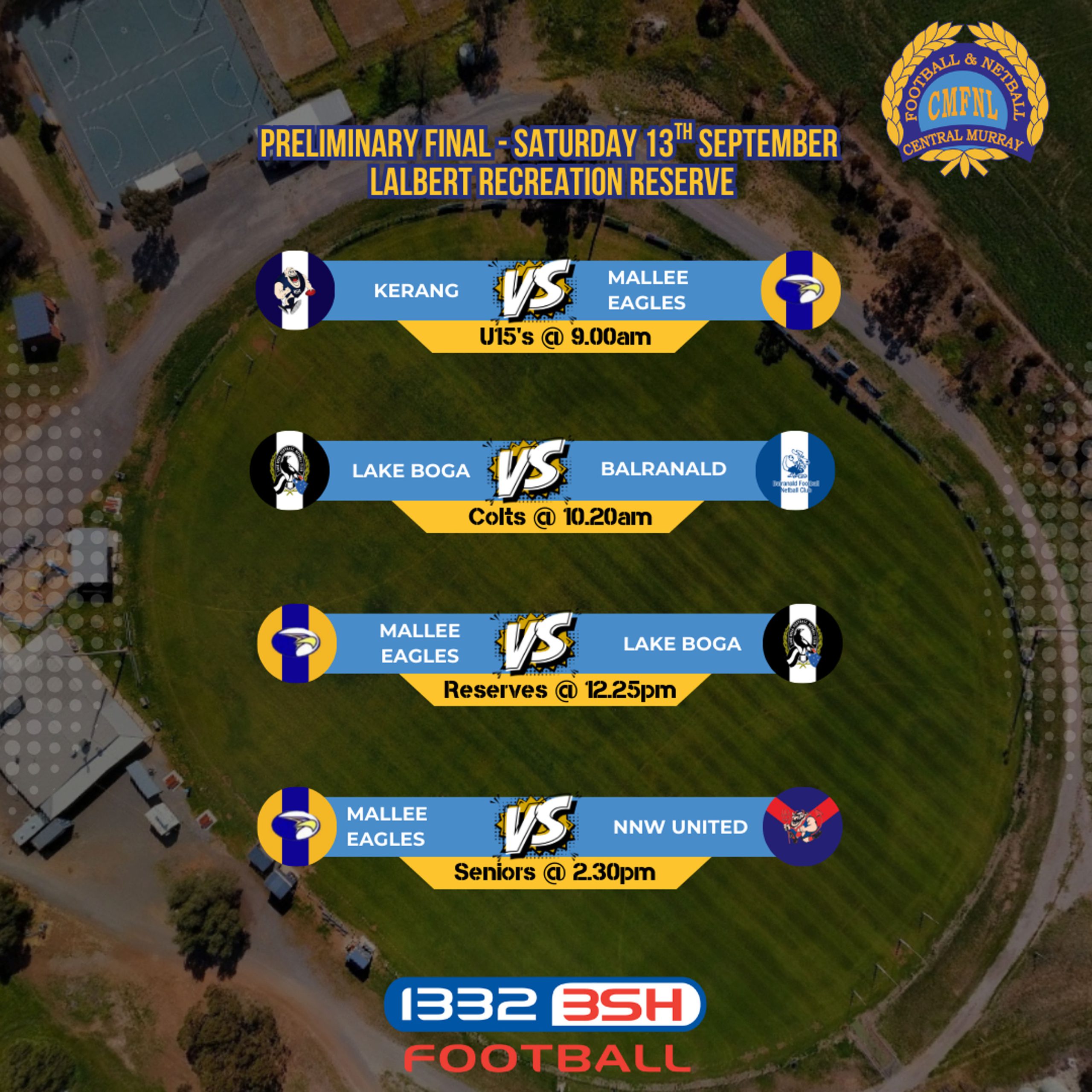 First clash on preliminary final day will be the Mildura Health Fund under-15s between Kerang and Mallee Eagles from 9am.